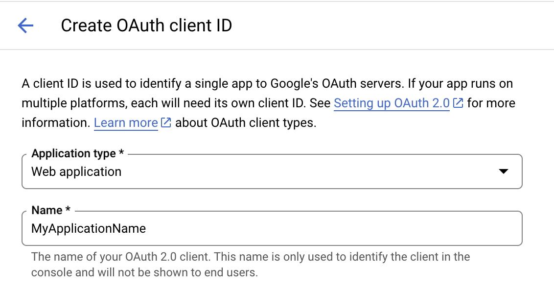 Click on "CREATE CREDENTIALS" and select "Oauth client ID". Select "Web Application" for "Application type" and enter the name of your application (see below).