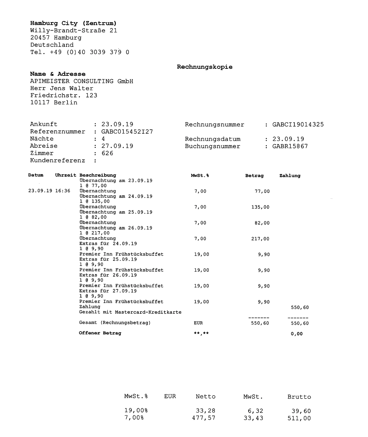 INSERT INTO Invoices (hotel_id, invoice_number, reservation_number, date, room_number, check_in_date, check_out_date, currency, total_net, total_tax, total_gross, total_charge, total_credit, balance_due, guest_company, guest_address, guest_name)