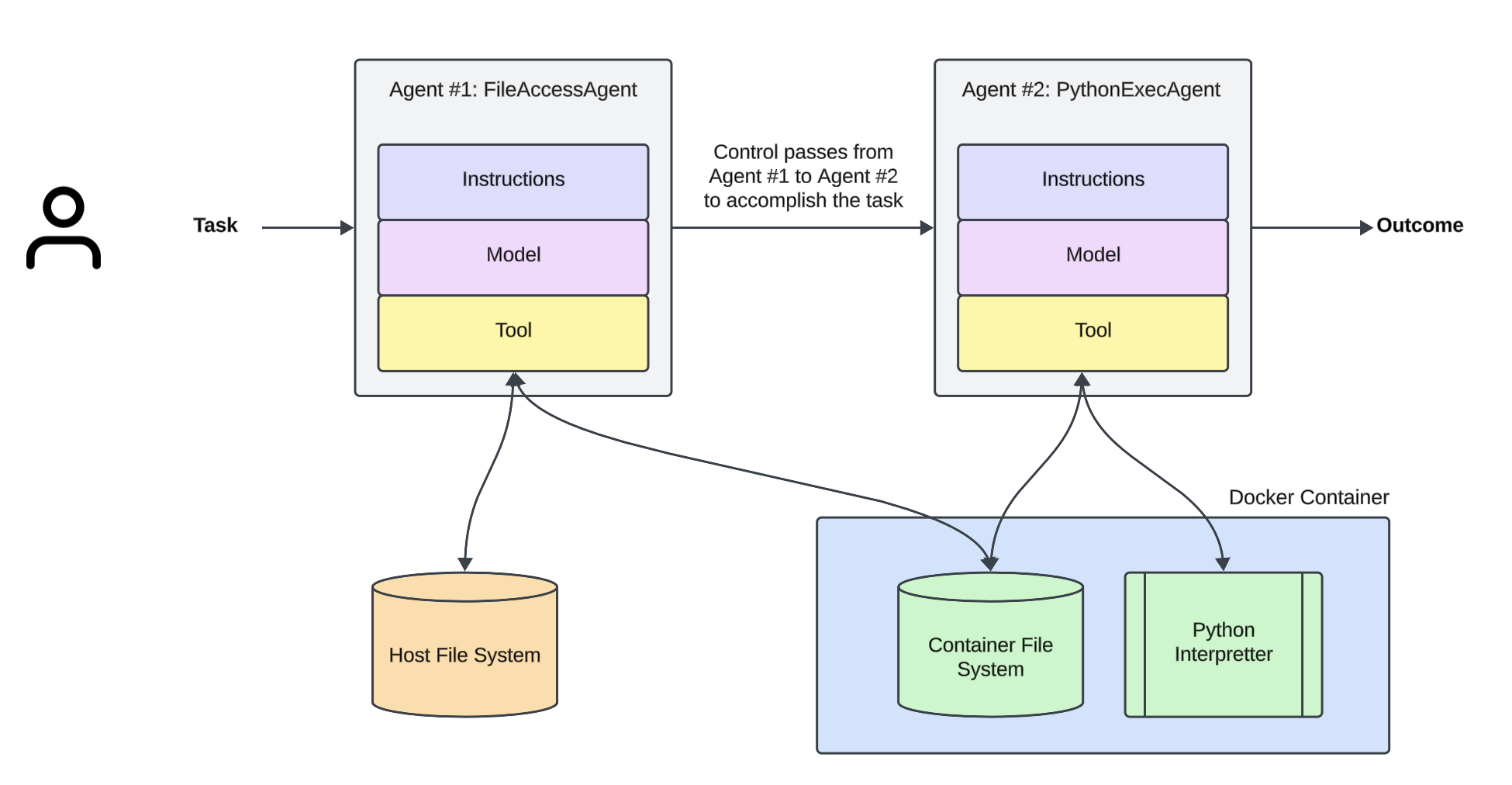 This separation concerns of the File Access (Agent 1) and the Code Generator and Executor (Agent 2) is crucial to prevent the LLM from directly accessing or modifying the host machine.